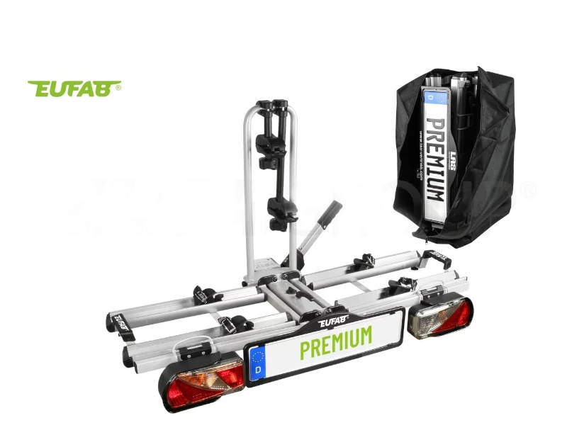 Prémiový skladací nosič Eufab Premium pre 2 bicykle, vrátane elektrobicyklov. Uzamykateľný, nosnosť 60 kg, ľahká montáž, sklápací systém.