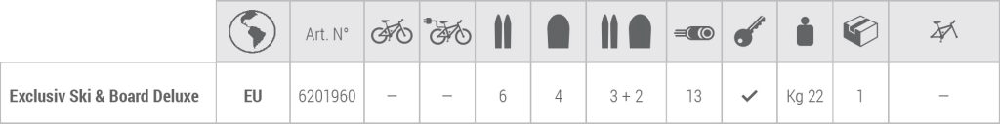 - Maximální kapacita nosiče: 6 párů lyží / 4 snowboardy / kombinace 3 páry lyží a 2 snowboardy.